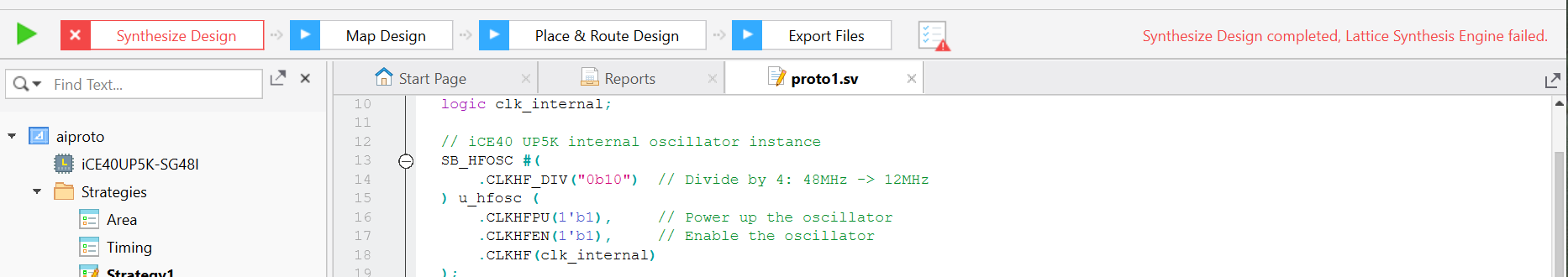 When I attempted to synthesize this design, I thrown the error “instantiating unknown module SB_HFSOSC. VERI-1063”. I typed the error message back into the LLM, and it corrected itself by instantiating the module “SB_HFOSC”. The LLM had falsely named the Lattice iCE40/UP5K primitive of the on-board FPGA.