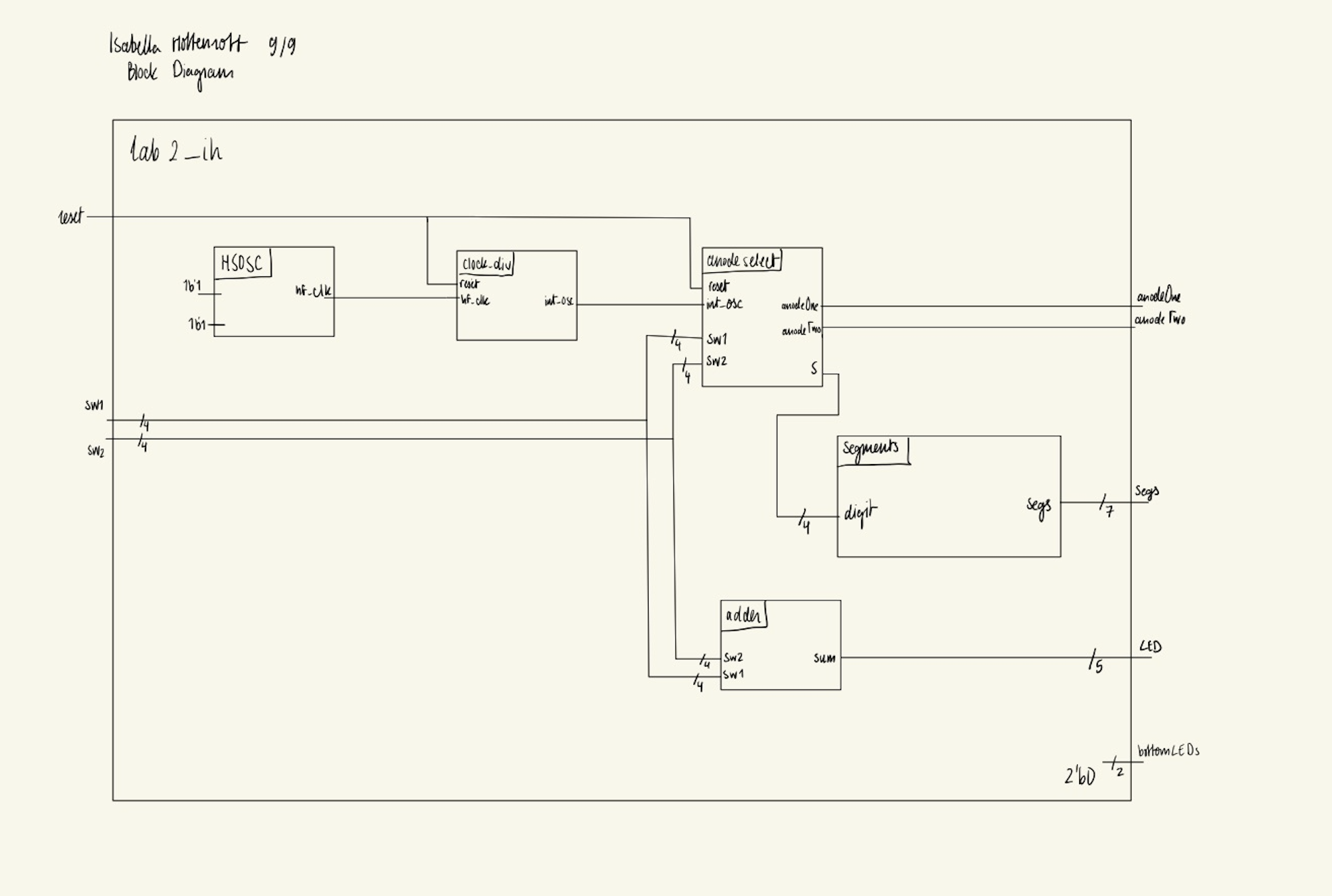 The block diagram above illustrates the lab2_ih design. The top level module, lab2_ih, takes in inputs: reset, sw1, and sw2. The module outputs to outputs to five leds (led), a single set of GPIO pins for the dual seven segment (segs), to both transistors to illuminate the proper segment anode (anodeOne, anodeTwo), and to the two remaining on-board LEDs to keep them from floating (bottomLEDs). Lab2_ih instantiates five submodules: the high-speed oscillator block (hf_osc), the clock divider to 60 Hz (clock_div), the adder (adder), the seven segments priority encoder (segments), and the anode-selecting module (anodeselect).