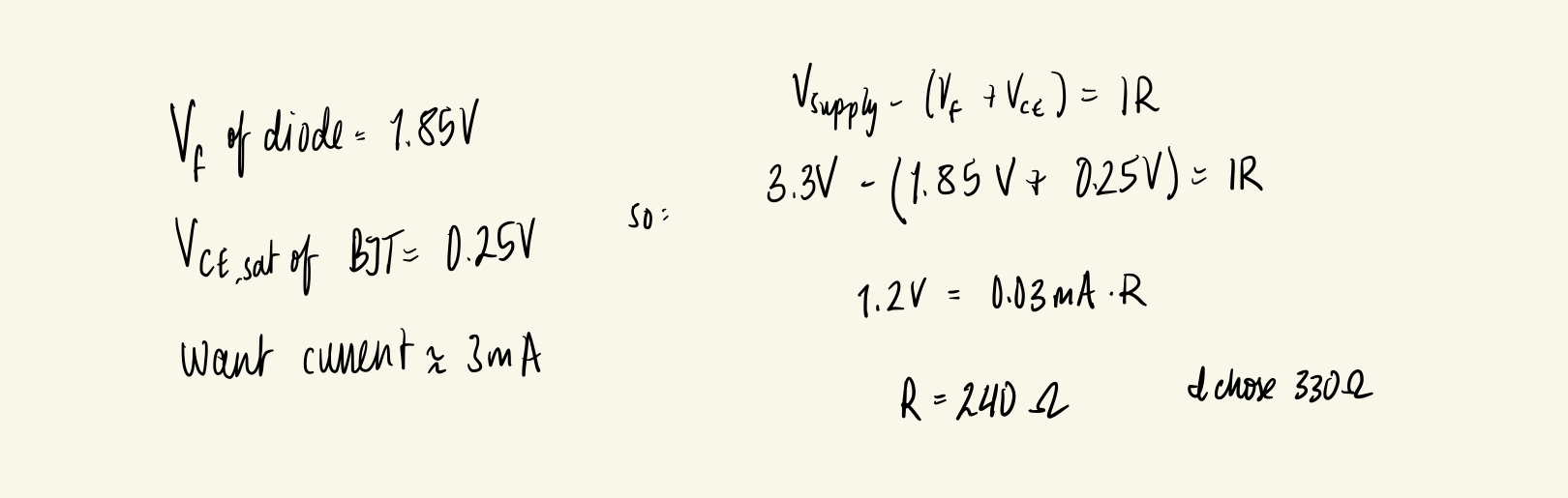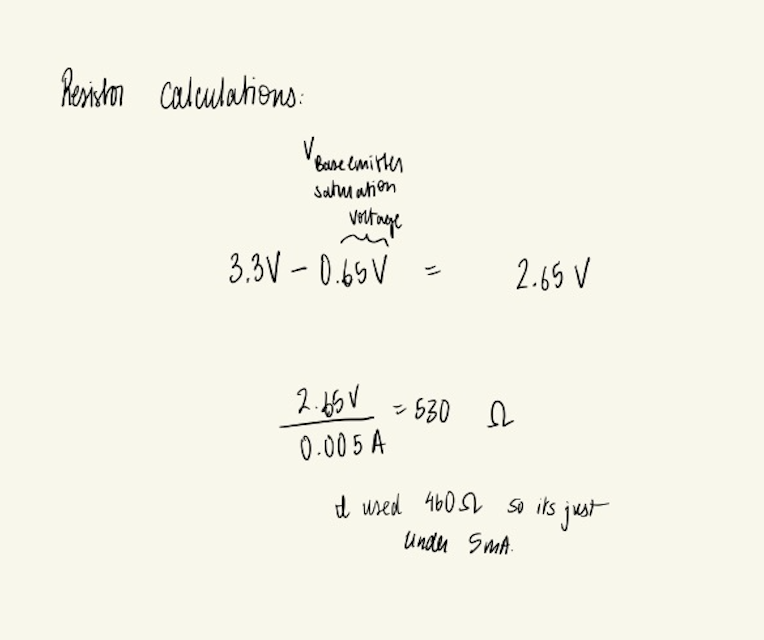 A 460 Ω resistor was placed between each transistor base and its corresponding GPIO pin to keep the base current below 5 mA, as specified in the datasheet. The calculation for this value is shown in Figure 1.