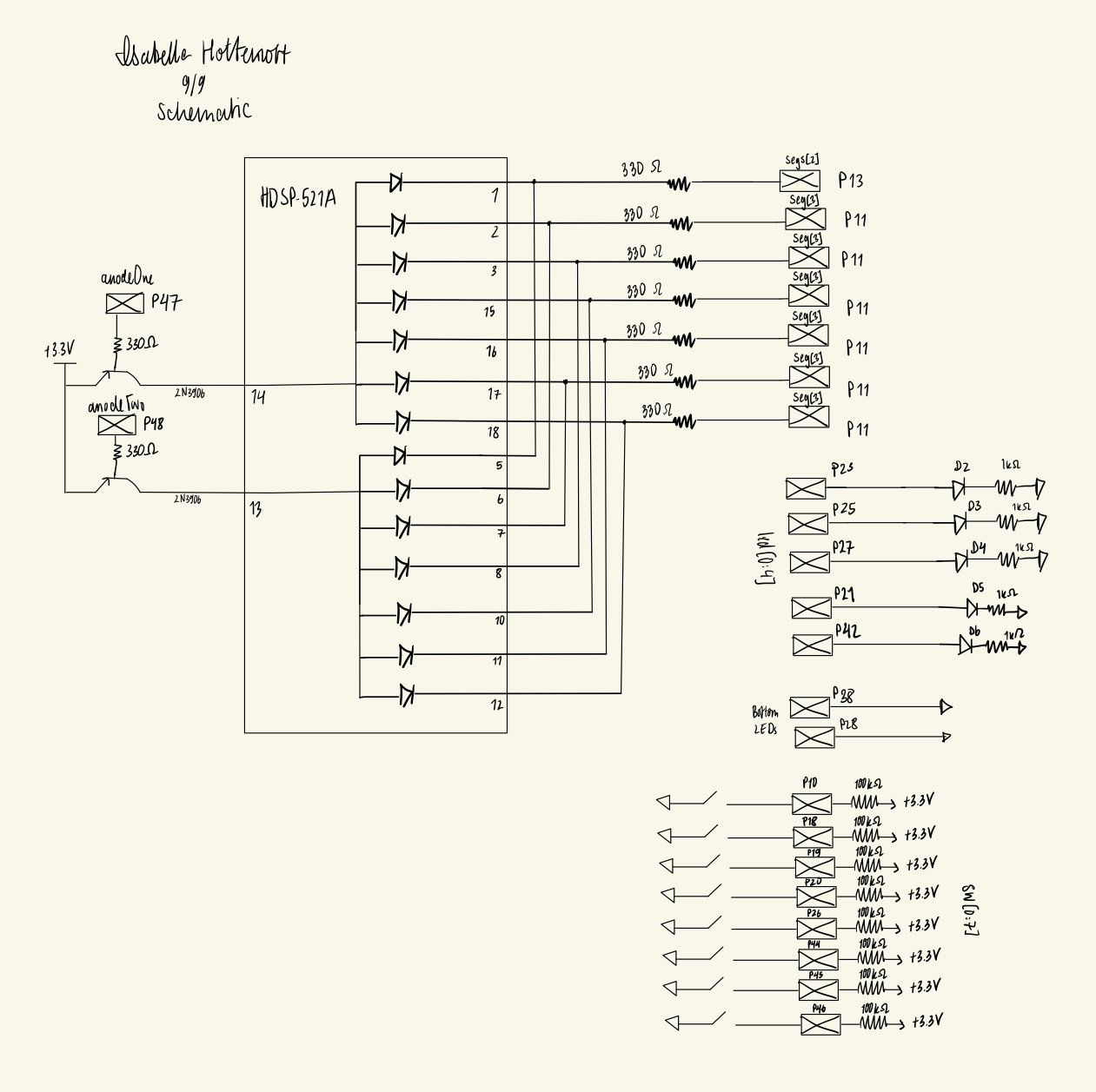 The Seven Segment Display module- a priority encoder- converted the 4-bit switch inputs into the corresponding seven-segment code. The HDSP-521A required more current than the FPGA could supply directly, so two 2N3906 PNP transistors were used to drive the common anodes. Each segment cathode was connected through a 330 Ω current-limiting resistor to achieve approximately 3 mA of segment current over the effective voltage drop: