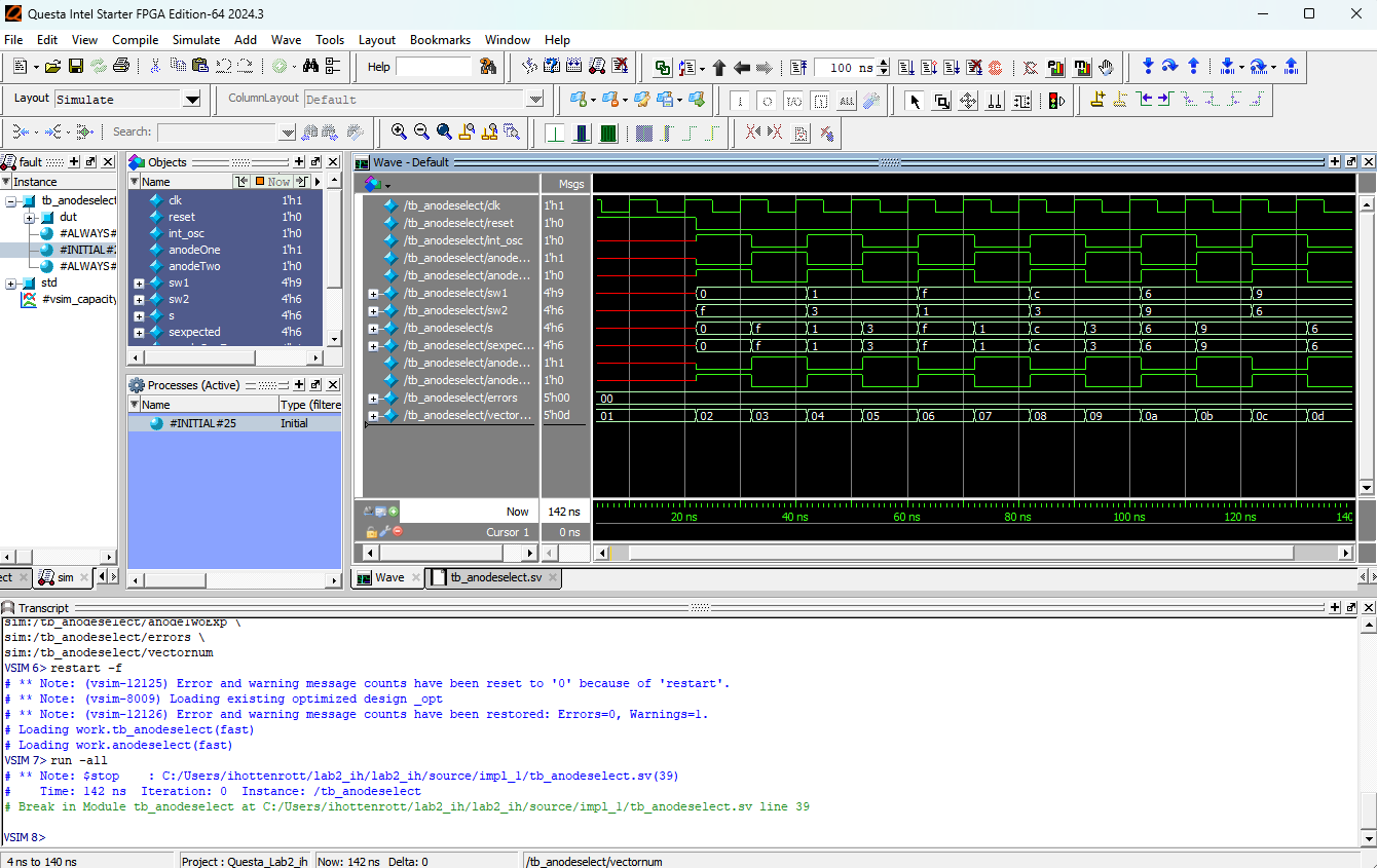 The testbench for the anodeselect module can be found here. Twelve handwritten test vectors were applied to verify that the 4-bit input produces the correct output from the segments module at each phase of the multiplexing clock, and that only one anode is ever asserted high. All checks passed with no errors.
