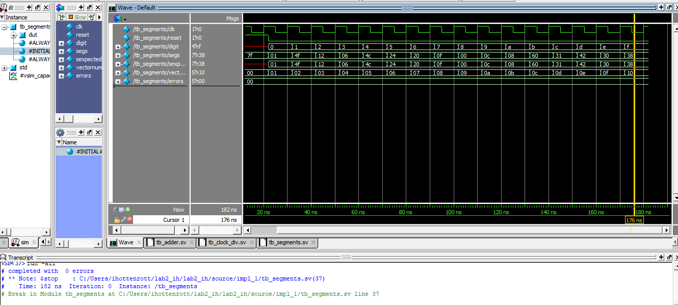 The testbench for the segments module can be found here. All possible 4-bit input combinations were exercised, and the resulting seven-segment outputs were verified to match the expected patterns. No errors occurred.