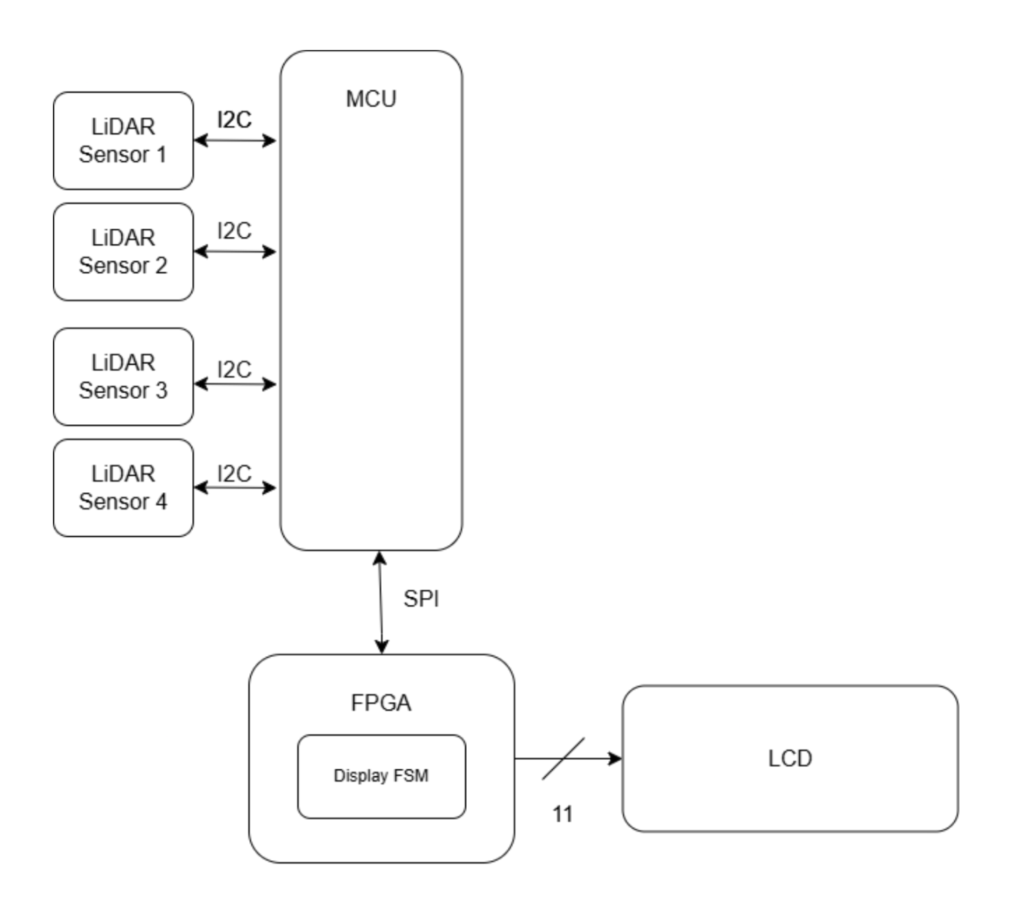 The main objective of this project is to build a rock-paper scissors game, where a human player plays against the computer. A LED Dot Matrix, driven by the FPGA, will display the computer’s play (rock, paper, or scissors), as well as any other pertinent information (score, countdown, etc). The player’s move will be picked up by a series of 5 LiDAR sensors. The five LiDAR sensors will be placed beneath the scanning platform and strategically positioned so that specific combinations of sensor activations correspond to particular game moves. The scanning platform will outline an area for players to position their hands, ensuring proper alignment and preventing misclassification of plays. Rock-paper-scissors provides three very distinct gestures Ensuring the LiDAR sensors work is the most crucial element (poses the highest risk) to the success of this project. The LiDARs are the main sensing mechanism that interfaces with the outside world, and their placement must be strategically optimized to consistently ensure that a player’s move is recognized. The design must ensure correct and consistent height classifications for the hand placements across a range of moves and player profiles. The design should also account for occasional missed reflections due to off-angle surfaces. Moreover, according to our trade study, the VL53L0X sensors can interfere with each other’s readings, requiring the design to time multiplex between the five sensors in retrieving the distance data.