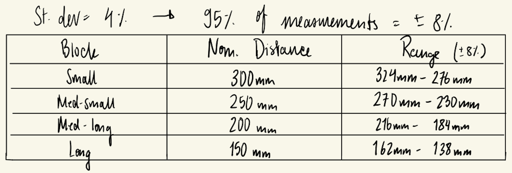 MCU Distance Range Calculations: Using the recommended 33ms scan time while indoors with a white target, we are given that the standard deviation is 4%. Therefore, 95% of measurements will fall within ±8% of the true distance. We will account for this with the following margins.