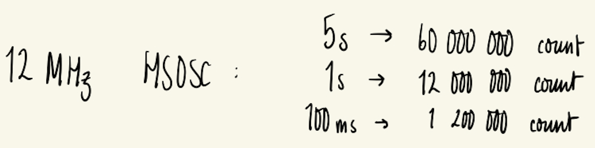 FPGA Timing Calculations: Using the High Frequency Oscillator We want the FPGA to measure 5s, 1s, and multiples of 100µS to control the display. We will use the 12 MHz HSOSC clock and therefore require the following counters: