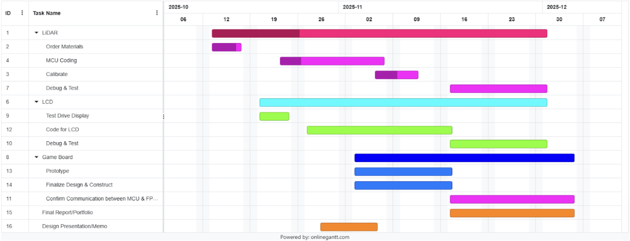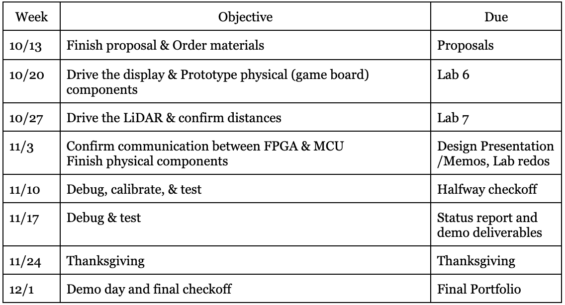 To portion the work, we will first create a shared github so we always have access to our main body of work. We will each take a task, and update the exact task week-by-week. It is important that we both gain experience with the LED Dot Matrix and the LiDAR, to both have awareness of code development, but more insight is gained in the debugging stage, so that is where we will prioritize working together.